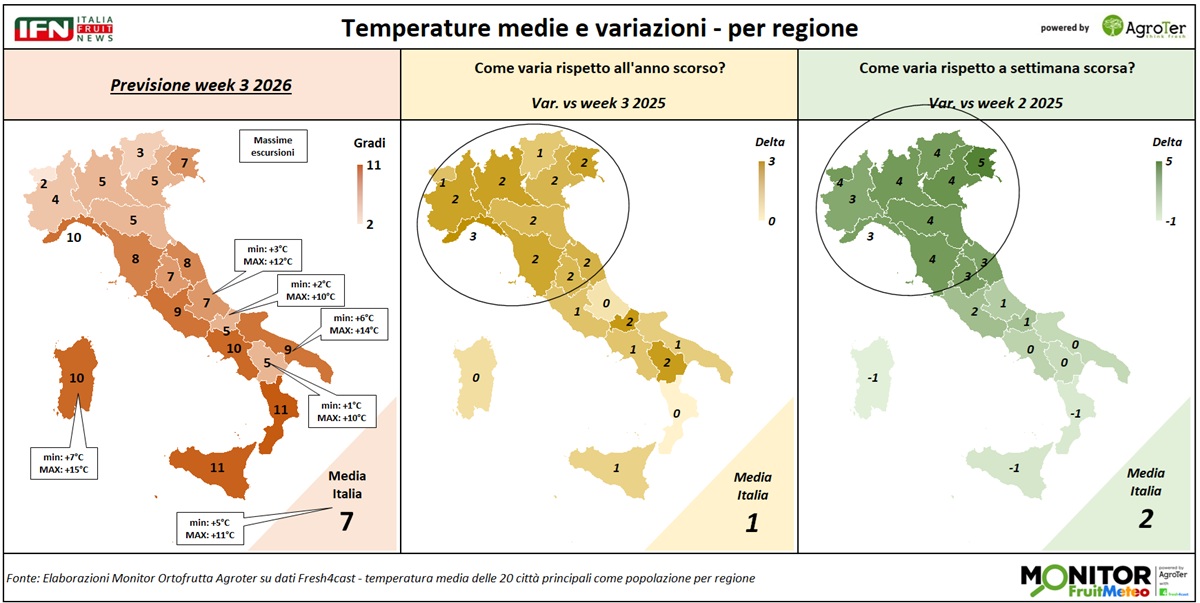 Le analisi del Monitor Ortofrutta si arricchiscono grazie a una nuova collaborazione dedicata a esplorare settimanalmente una variabile spesso decisiva per il settore ortofrutticolo: il meteo. Tra i diversi fattori che influenzano le condizioni climatiche, questa nuova rubrica si concentra in particolare sulle temperature medie registrate lungo la Penisola, con il supporto di Fresh4cast, una piattaforma software in cloud specializzata nella previsione della domanda e nell'ottimizzazione della supply chain per il settore ortofrutticolo.