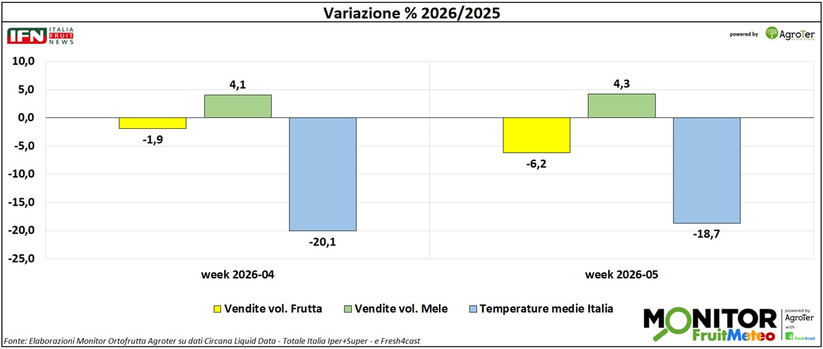 Mettendo in relazione questi dati con l’andamento dei consumi nel canale Iper+Super aggiornati fino alla week 5, emerge un elemento interessante: il marcato calo delle temperature medie rispetto allo scorso anno – pari a circa 19 punti percentuali nelle settimane considerate – coincide con una crescita delle vendite di mele intorno al +4%, nonostante la frutta nel suo complesso registri una contrazione. Un segnale che suggerisce una certa sensibilità dei consumi di mele alle dinamiche meteo-climatiche, con una domanda che tende a rafforzarsi nelle fasi più fredde. Alla luce del nuovo abbassamento termico atteso sulla Penisola per questa settimana, si consumeranno quindi più mele?