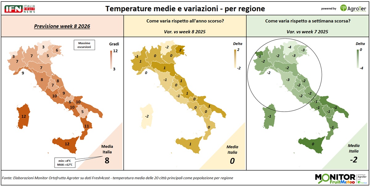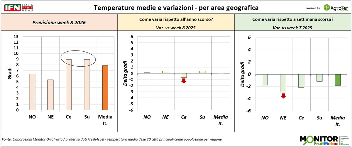 Le analisi del Monitor Ortofrutta si arricchiscono grazie a una nuova collaborazione dedicata a esplorare settimanalmente una variabile spesso decisiva per il settore ortofrutticolo: il meteo. Tra i diversi fattori che influenzano le condizioni climatiche, questa nuova rubrica si concentra in particolare sulle temperature medie registrate lungo la Penisola, con il supporto di Fresh4cast, una piattaforma software in cloud specializzata nella previsione della domanda e nell'ottimizzazione della supply chain per il settore ortofrutticolo.