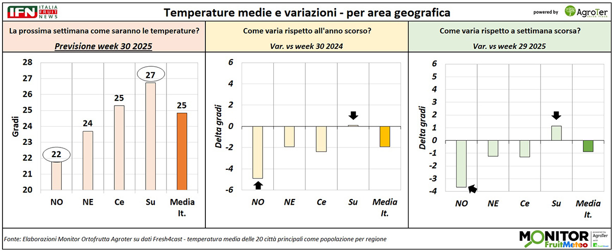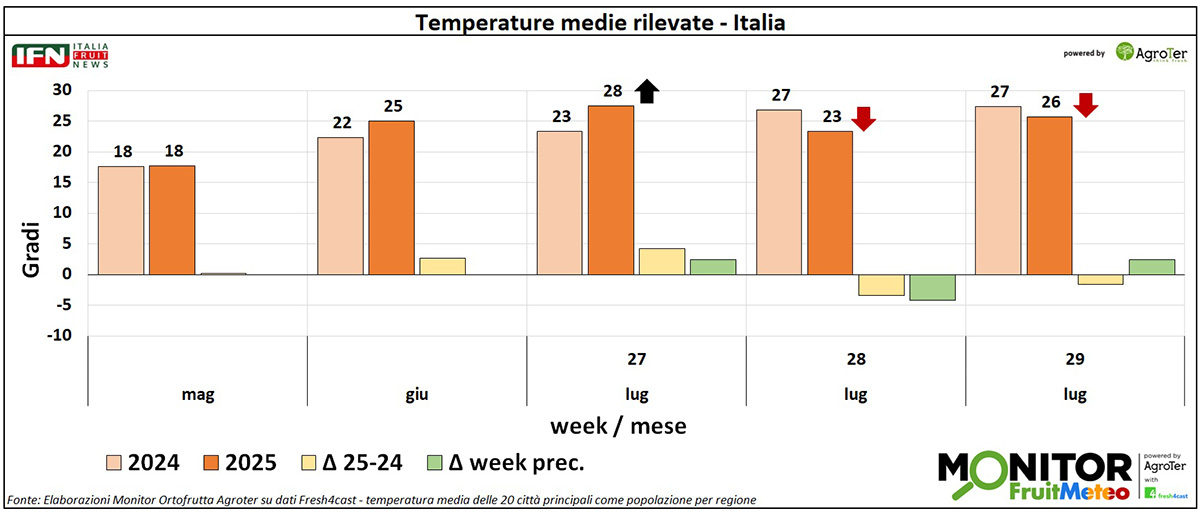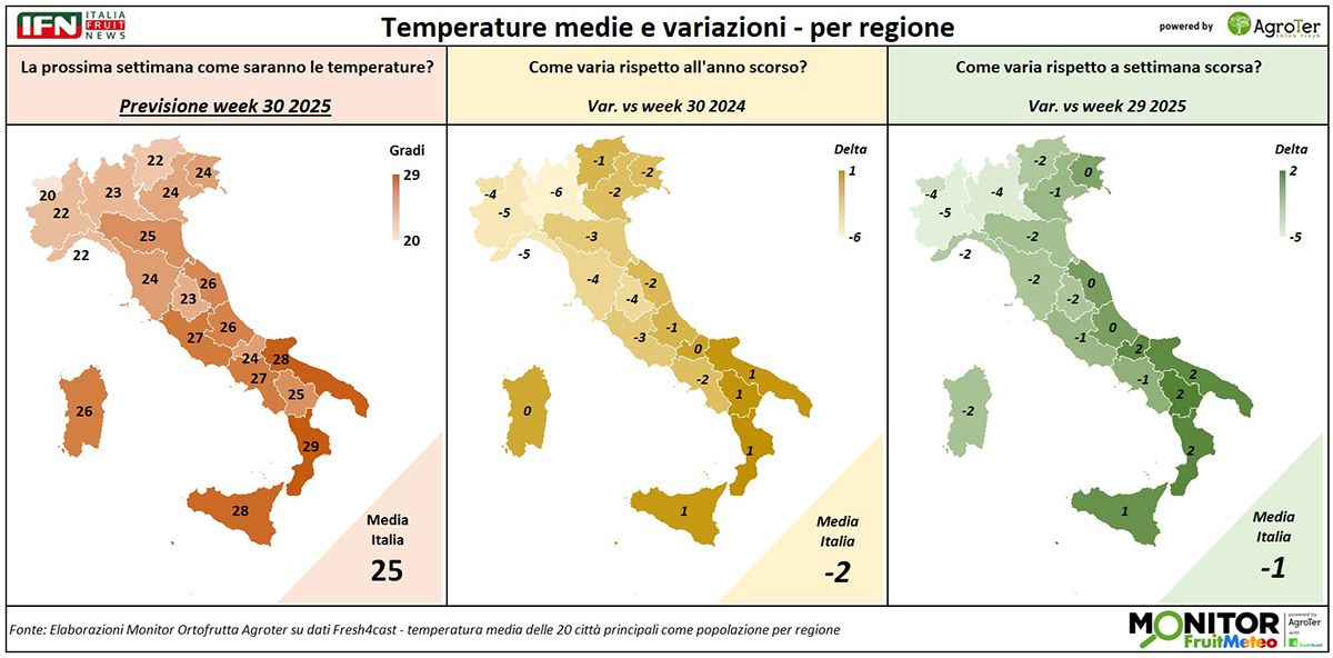 Per la settimana 30 si prevede un calo delle temperature rispetto sia alla settimana precedente sia allo stesso periodo del 2024, sebbene si tratti di una diminuzione contenuta. Il Paese sarà sostanzialmente diviso in due, con condizioni climatiche differenti tra Nord e Sud, dove il caldo si farà sentire in modo diverso. Le analisi del Monitor Ortofrutta, realizzate in collaborazione con Fresh4cast, registrano nella settimana 29 – appena trascorsa - un lieve rialzo termico, pari a 2 gradi, rispetto alla settimana precedente. Nonostante ciò, le temperature sono risultate comunque inferiori rispetto al 2024 (-2 gradi), sebbene con uno scarto meno marcato rispetto alla settimana 28, in cui il calo era stato di 4 gradi.