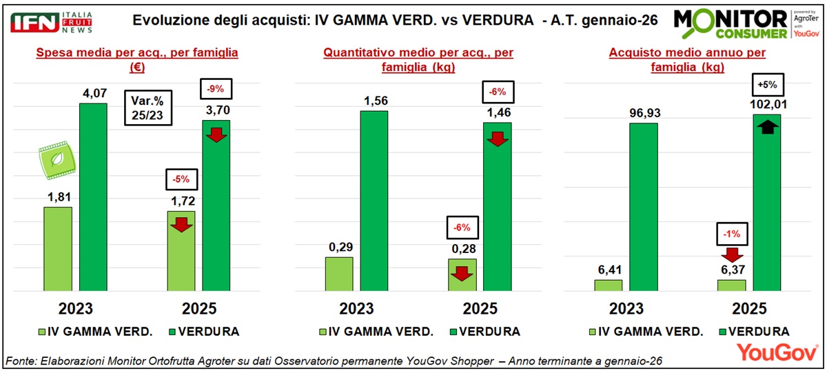 Anche la frequenza di acquisto risulta in aumento in entrambi i comparti, ma con intensità diversa: la crescita è più marcata nella verdura (+12%), mentre nella IV Gamma si ferma al +6%.