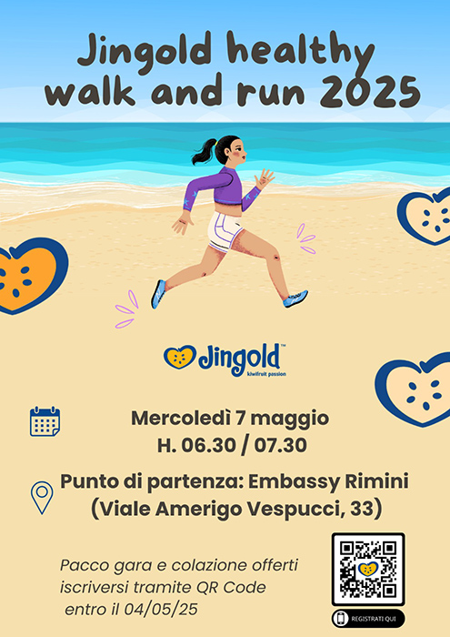 Mercoledì 7 maggio sarà invece la giornata dedicata al benessere e al rapporto tra kiwi e lifestyle. Si parte all’alba con la “Jingold Healthy Walk & Run”, una corsa sul lungomare di Rimini riservata a visitatori e operatori di Macfrut: partenza alle 6.30 all’Embassy, in viale Amerigo Vespucci 33, corsa verso il molo e al ritorno all’Embassy colazione conviviale. Per iscrizioni, entro il 4 maggio, è necessario compilare il form dedicato (clicca qui per approfondire). La partecipazione è gratuita, con colazione e pacco gara offerti dall’azienda. L’iniziativa nasce come un momento di incontro dinamico che coniuga sport e benessere, esprimendo appieno i valori fondanti di Jingold: promuovere una corretta alimentazione e uno stile di vita attivo e rafforzare il legame tra agricoltura innovativa e salute quotidiana.