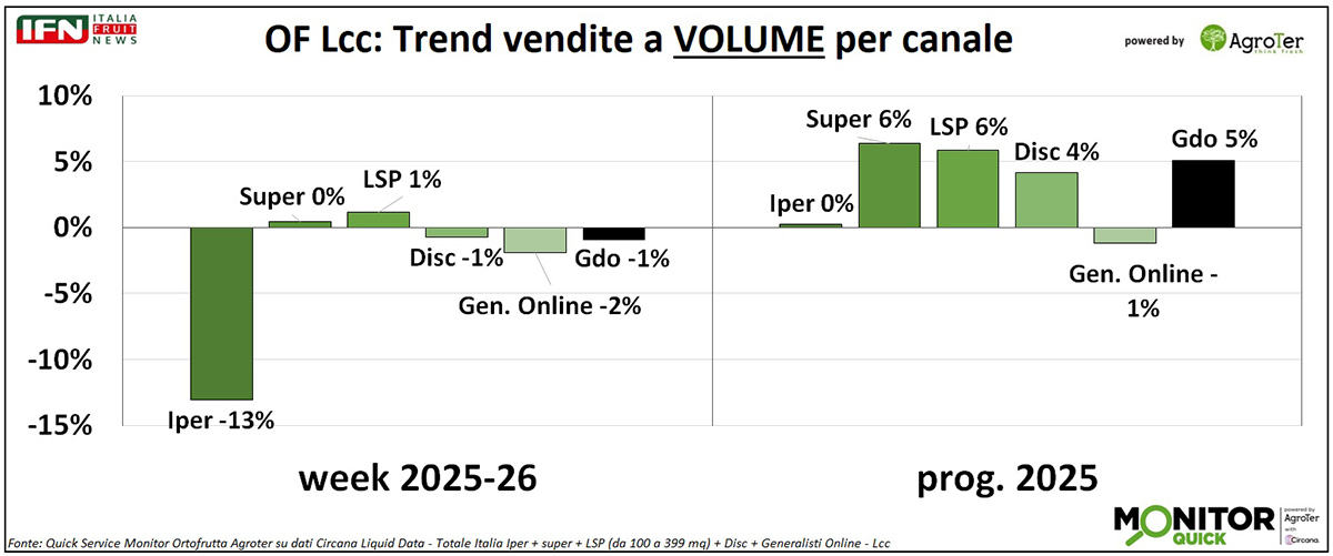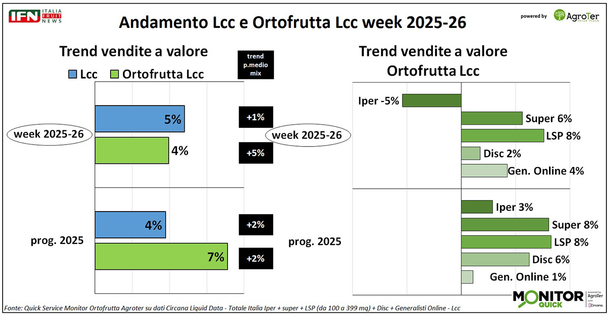 Nella settimana 26, le vendite a valore dell’ortofrutta Lcc registrano un incremento, trainato principalmente dall’aumento del prezzo medio mix. Tuttavia, i volumi restano inferiori rispetto al 2024. Tutti i canali mostrano segnali di difficoltà, in particolare gli ipermercati. Le elevate temperature di giugno incentivano le vendite di frutta di IV Gamma, con una crescita diffusa su tutti i canali, soprattutto nei discount. Nonostante ciò, la quota per la categoria di questo format rimane ancora contenuta rispetto all’intera IV-V Gamma.