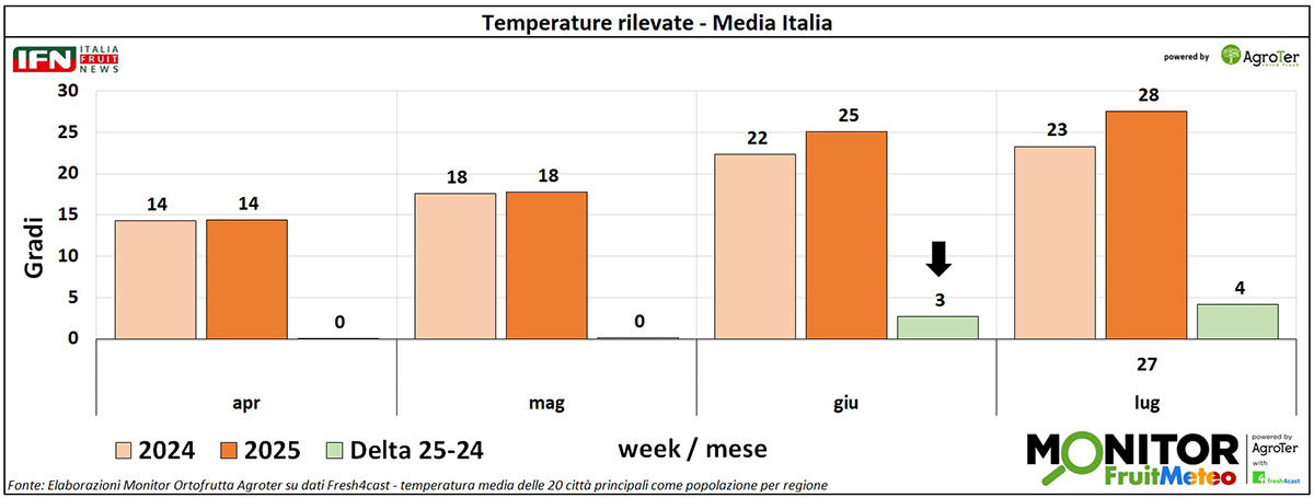 L’aumento delle temperature ha sicuramente avuto un ruolo determinante. A giugno e nei primi giorni di luglio, infatti, si registrano incrementi termici di 3-4 gradi rispetto al 2024, mentre nei due mesi precedenti le temperature sono rimaste in linea con l’anno precedente.