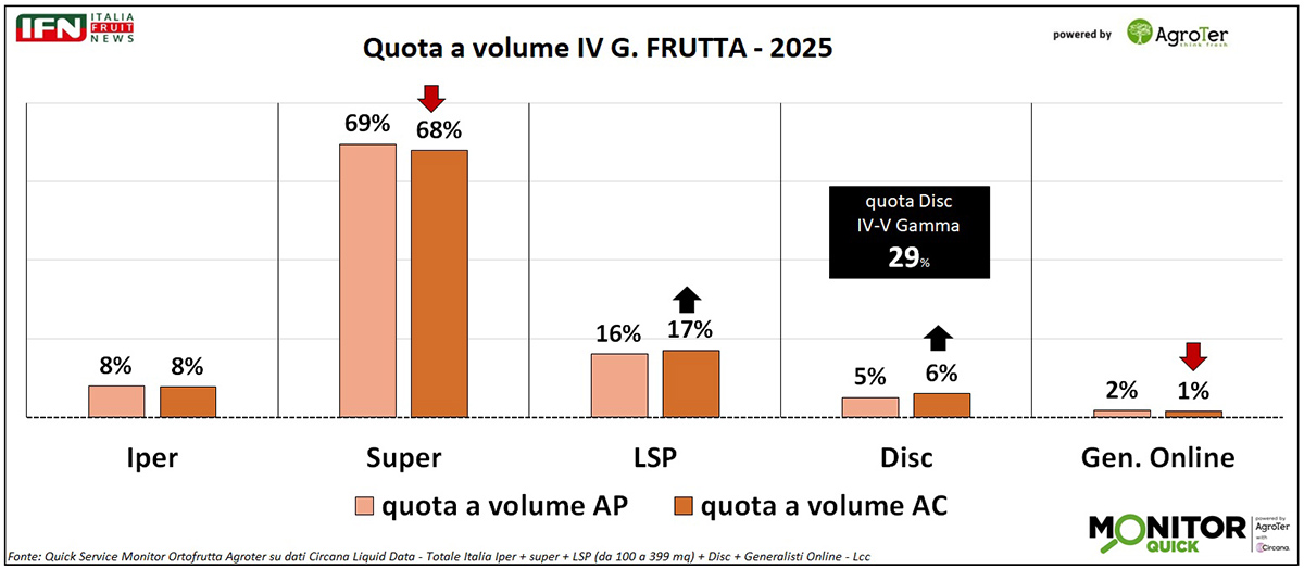 Per il discount, la quota della frutta di IV Gamma si attesta al 6%, in crescita di 1 punto rispetto all’anno precedente. Tuttavia, rimane ben al di sotto rispetto alla quota complessiva di IV-V Gamma per questo canale, che nel 2025 raggiunge il 29% a volume. Un divario che evidenzia il grande potenziale di crescita della frutta pronta all’interno del format discount. (bf)