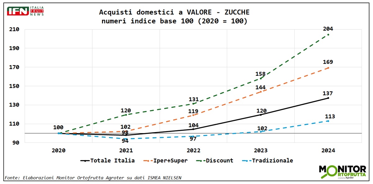 La zucca si rivela così un prodotto capace di generare ampie possibilità espositive, facilmente “teatralizzabile” nei punti vendita e protagonista ricorrente dei contenuti social, spinta anche dalla forte visibilità garantita dalla festività di Halloween. Un'accelerazione stagionale che, però, non si esaurisce con il 31 ottobre: la zucca conquista infatti anche una sua dimensione “decorativa” nelle settimane successive, ampliando il proprio periodo di attrattività e confermandosi una referenza strategica per tutto l’autunno.