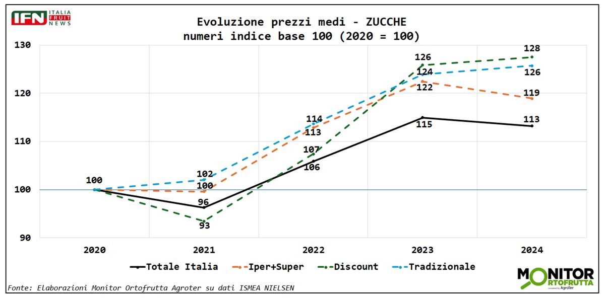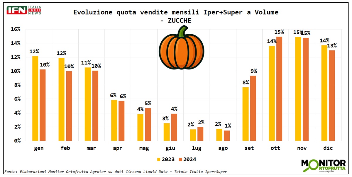 Sono questi i principali Highlights che emergono dalle analisi del Monitor Ortofrutta di Agroter per la categoria del mese di novembre che ha come protagonista la zucca e che sarà oggetto della Diretta IFN che andrà in onda il prossimo 13 novembre alle ore 12.00 sui nostri canali social.