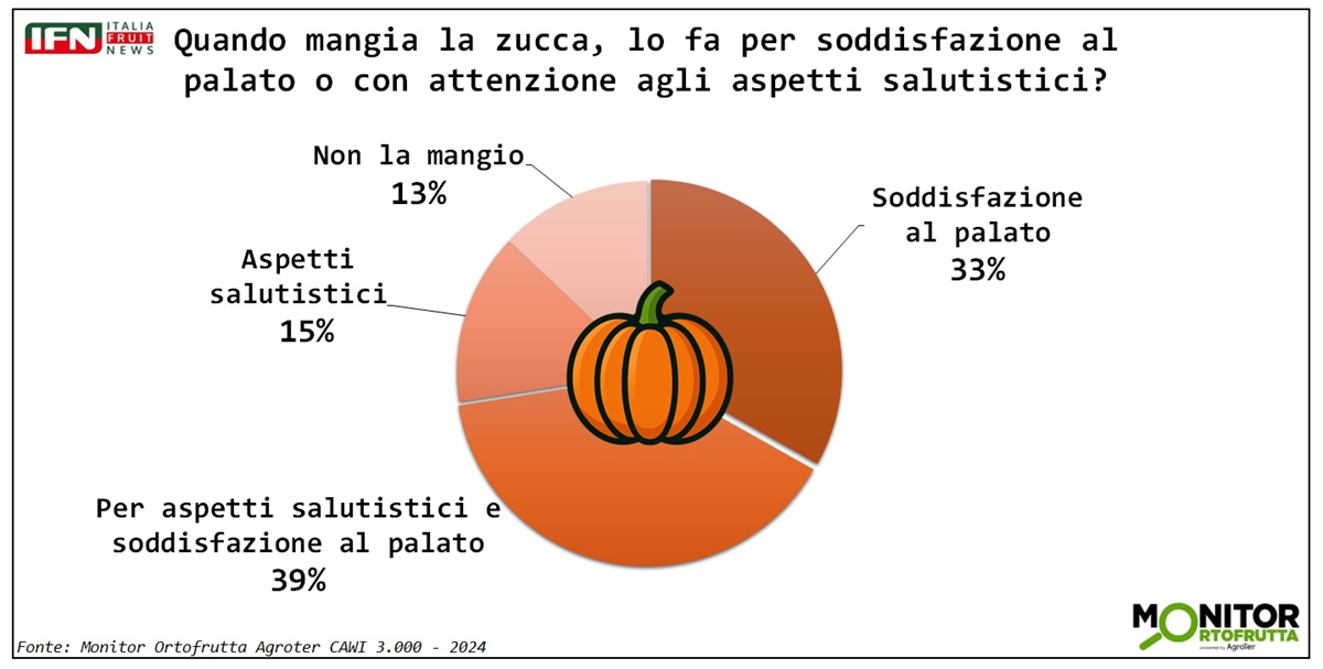 Ma cosa spinge davvero gli italiani ad acquistare la zucca? Le analisi del Monitor Ortofrutta di Agroter — basate su un campione di 3.000 responsabili d’acquisto — indicano come il principale driver sia il binomio salute + gusto, citato da quasi 4 consumatori su 10. Seguono il solo sapore (33%) e le sole motivazioni salutistiche (15%). Un 13% del campione, invece, dichiara di non consumarla. Ne emerge dunque un prodotto percepito come salubre ma apprezzato soprattutto per il sapore: una risposta piuttosto logica se si pensa alla sua versatilità in cucina.