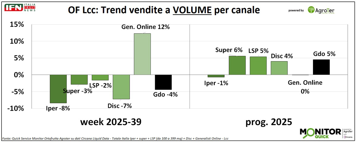La week 39 segna la chiusura del mese di settembre, ma le vendite a valore dell’ortofrutta Lcc restano sostanzialmente stagnanti. L’aumento del prezzo medio mix (+4 punti) si conrrappone a una netta contrazione dei volumi, in calo del 4% nella Gdo, un peggioramento rispetto al -3% e -2% registrati nelle due settimane precedenti. La flessione coinvolge tutti i canali fisici, con le perdite più marcate negli ipermercati (-8%) e nei discount (-7%). Unica eccezione positiva è rappresentata dall’online, in crescita del 12%, sebbene il suo peso sul totale resti ancora marginale (1,1% a volume).