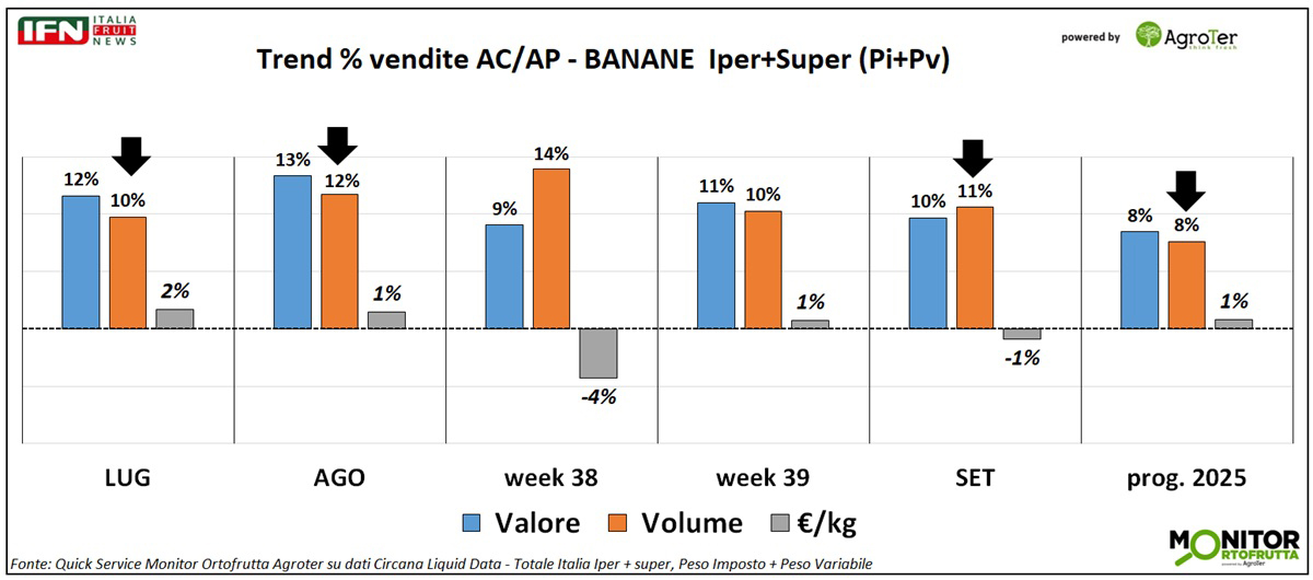 Le vendite del reparto ortofrutta in ipermercati e supermercati sono sostenute da alcune categorie chiave, particolarmente rilevanti nel periodo di riapertura delle scuole. Tra queste spiccano le banane, che da inizio anno mostrano una solida crescita dei consumi (+8% nel progressivo da gennaio), con un’accelerazione a doppia cifra durante l’estate (+10% a luglio e +12% ad agosto) e un ulteriore incremento nel mese di settembre (+11%).