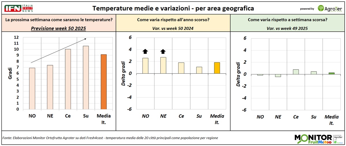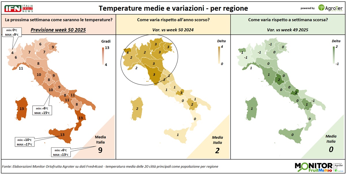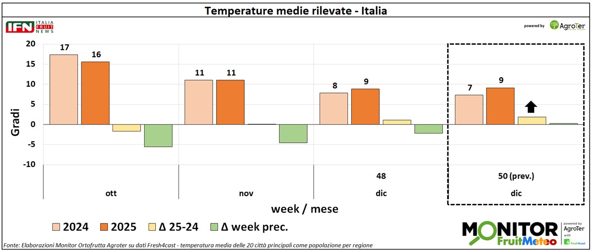 Le temperature miti proseguiranno anche questa settimana, con valori medi intorno ai 9°C sull'intera penisola, come già registrato nei giorni scorsi, nonostante l’inizio dell’inverno meteorologico. Il clima risulterà inoltre più caldo rispetto al 2024 e in modo ancor più evidente rispetto alla settimana precedente. Questi sono i principali risultati attesi delle analisi del Monitor Ortofrutta, realizzate in collaborazione con Fresh4cast. per la settimana in corso.