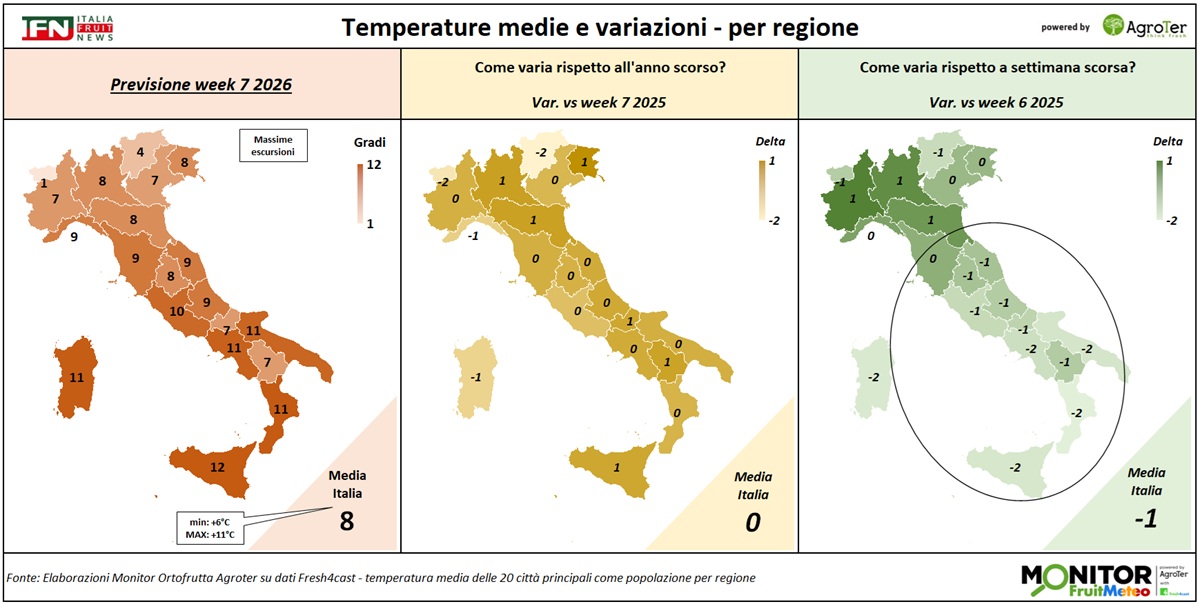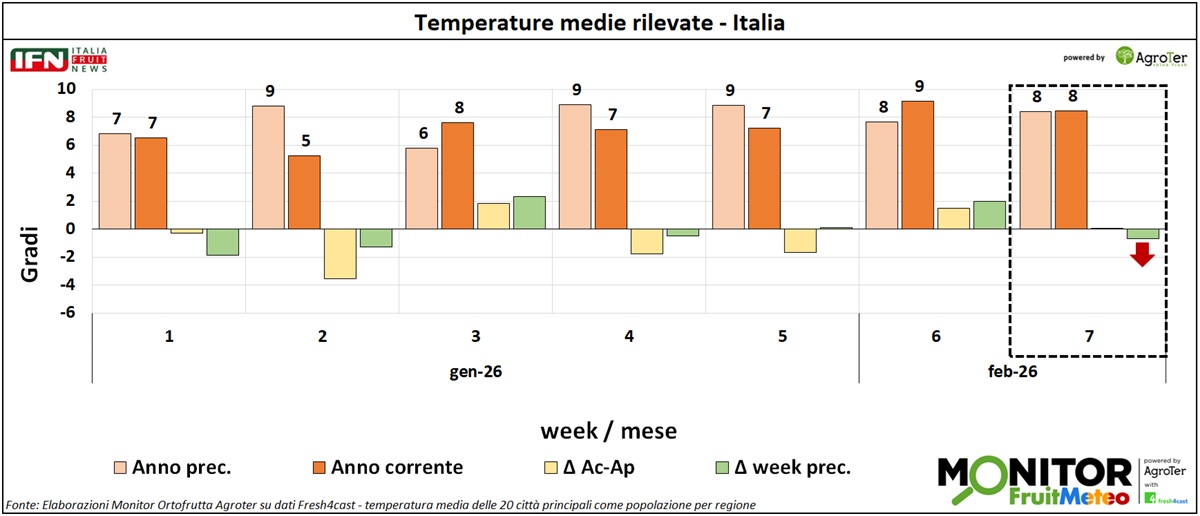 Le analisi del Monitor Ortofrutta si arricchiscono grazie a una nuova collaborazione dedicata a esplorare settimanalmente una variabile spesso decisiva per il settore ortofrutticolo: il meteo. Tra i diversi fattori che influenzano le condizioni climatiche, questa nuova rubrica si concentra in particolare sulle temperature medie registrate lungo la Penisola, con il supporto di Fresh4cast, una piattaforma software in cloud specializzata nella previsione della domanda e nell'ottimizzazione della supply chain per il settore ortofrutticolo.