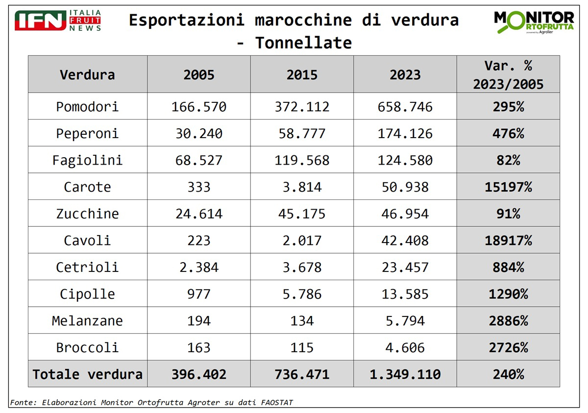 I pomodori, vero pilastro dell’export marocchino, rappresentano quasi il 50% delle esportazioni complessive a volume di ortaggi, e sono quadruplicate in vent’anni superando 600 mila tonnellate.  Seguono peperoni e fagiolini, che insieme valgono il 22%. Tutti i prodotti mostrano comunque una crescita sostenuta, con un incremento complessivo del 240% negli ultimi anni.