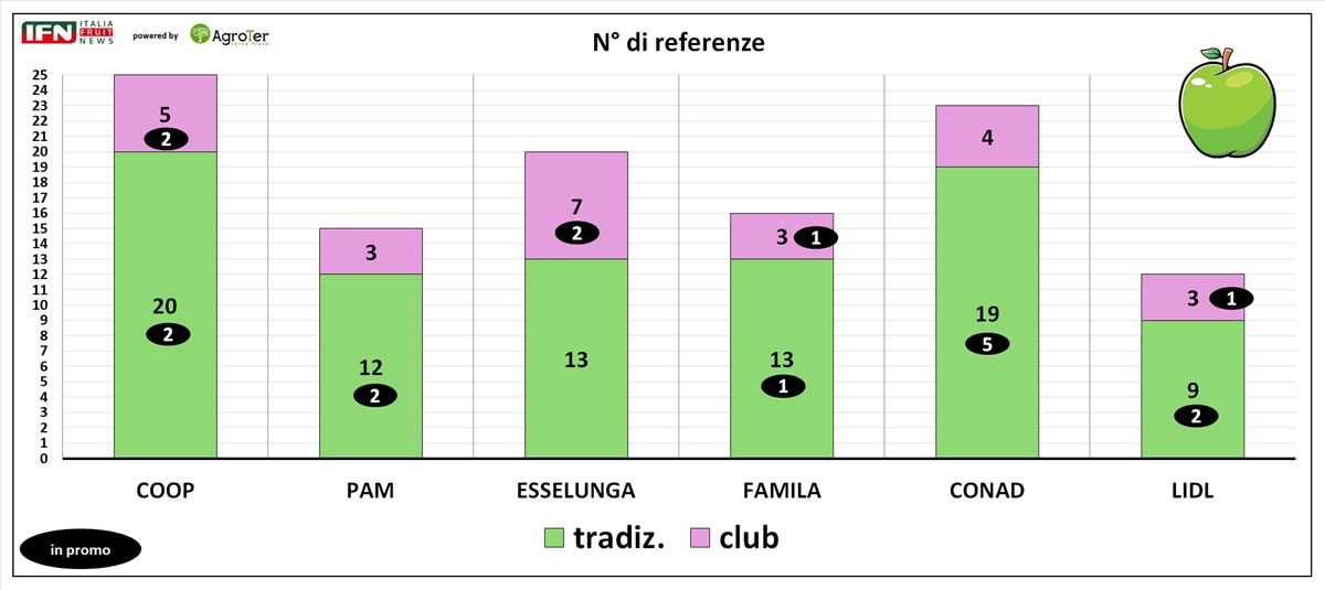 Esselunga è l’insegna che punta maggiormente sulle mele club, con 7 articoli a scaffale; Coop e Conad ne offrono rispettivamente 5 e 4, mentre le altre insegne si attestano su 3.