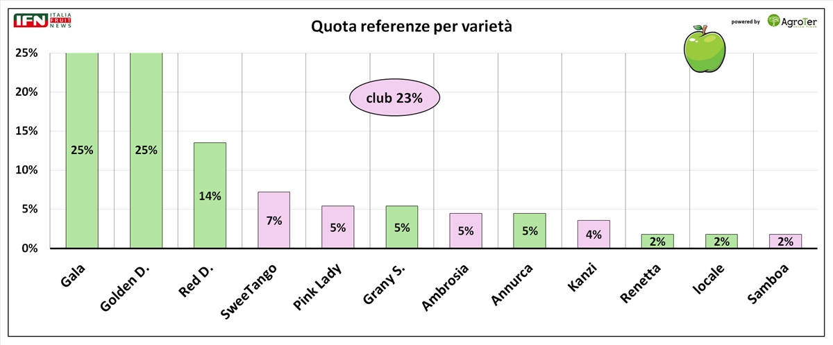 Nel complesso, le varietà club rappresentano il 23% del totale, a conferma della prevalenza delle varietà tradizionali. Va però considerato che le mele club vengono introdotte sul mercato in modo graduale, seguendo una logica più legata alla stagionalità.