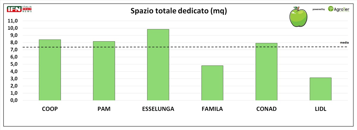 Tra le insegne, Esselunga è quella che dedica lo spazio maggiore, seguita da Coop, Pam e Conad, tutte con superfici superiori alla media. Più contenuta, invece, la presenza a scaffale per Famila e Lidl.
