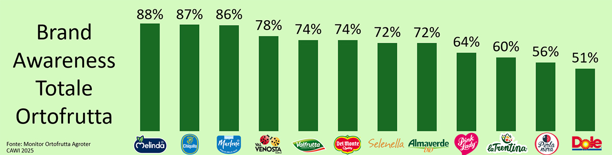 Il brand è passato dal 18,57% di notorietà top of mind e spontanea della rilevazione 2024 al 26,61% del 2025 nella categoria frutta, con un incremento di oltre 7 punti. “Ciò che è peculliare, in un comparto maturo come le mele”, ha sottolineato Roberto Della Casa, "è l'aumento della notorietà, di oltre 12 punti, nel segmento degli under35 che nel 2025 supera il 30%. Crescere nella fascia di popolazione più giovane è, infatti, la vera sfida per tutti, poiché è quello più complesso nel quale registrare incrementi. Come leggete questa performance? Vi aspettavate di ricevere il riconoscimento?"