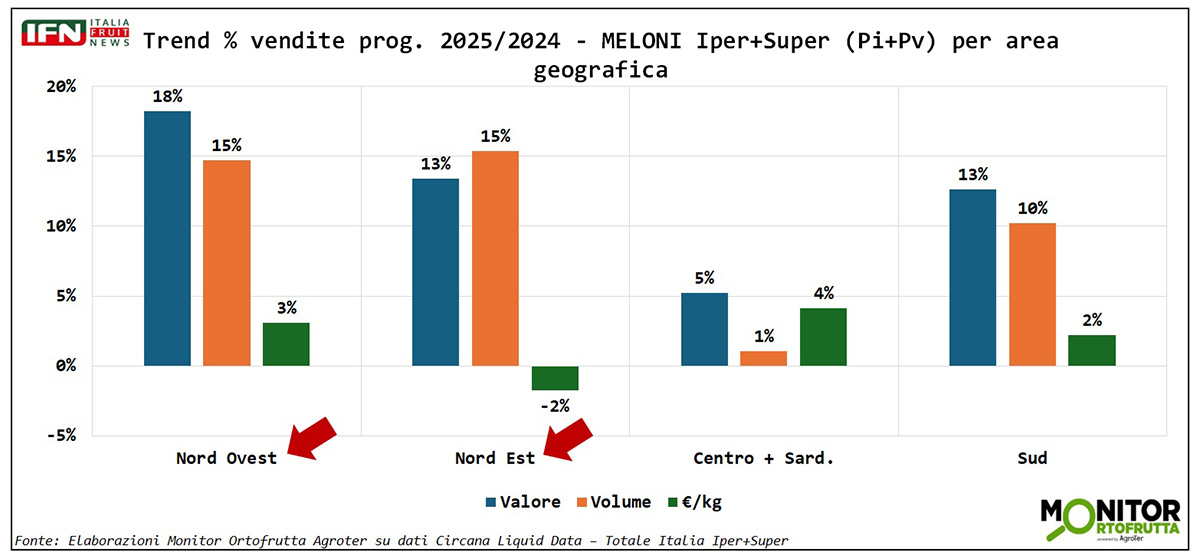A guidare il trend positivo dell’anguria è il Nord Est, spinto anche dalle temperature favorevoli, seguito da un Nord Ovest in crescita. Buoni segnali anche dal Sud, mentre il Centro Italia mostra un leggero calo dei volumi.