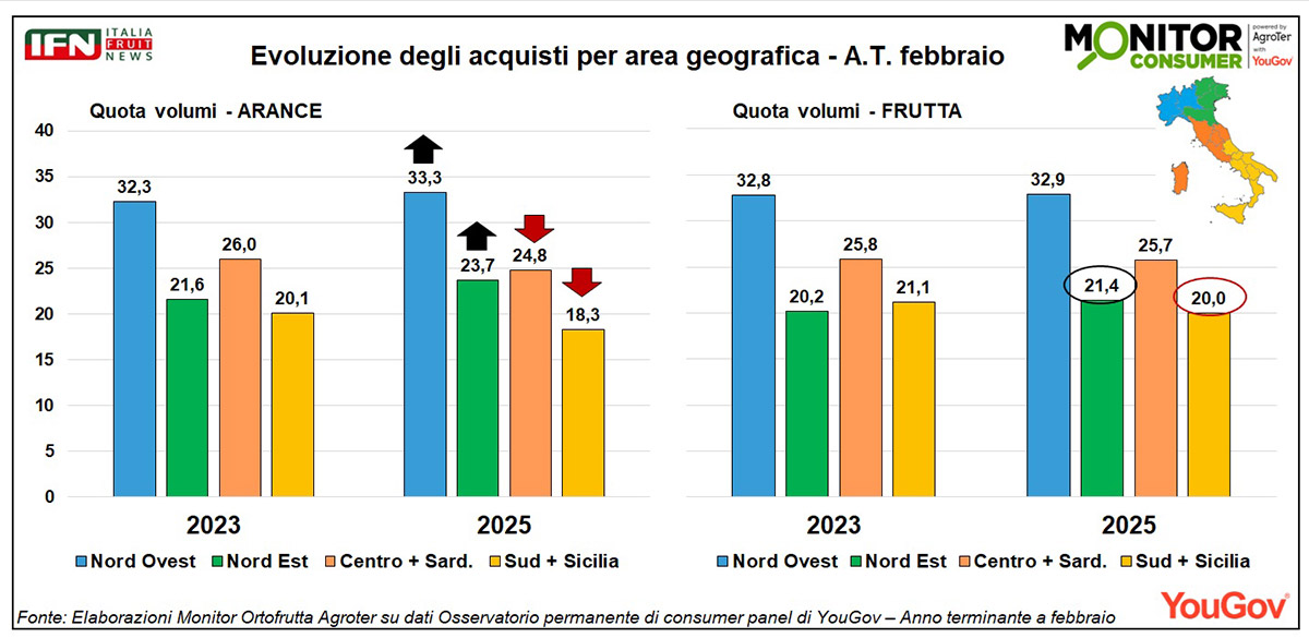 Anche il Centro Italia evidenzia dinamiche simili a quelle del Mezzogiorno, con una flessione nelle quote dei consumi di arance a fronte di una stabilità della frutta. Al contrario, le aree del Nord Est e del Nord Ovest mostrano performance migliori per le arance rispetto alla frutta in generale, evidenziando un comportamento d’acquisto più favorevole e in controtendenza rispetto al Centro-Sud.