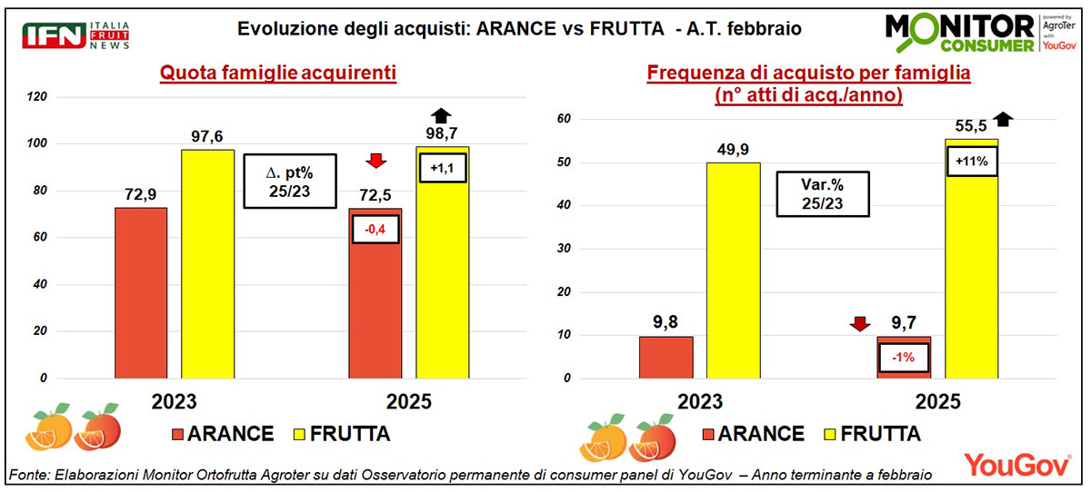 Per quanto riguarda la spesa media per acquisto, le arance mostrano una sostanziale stabilità, a differenza della frutta in generale che registra una lieve flessione del 2%. Anche l’analisi dei quantitativi medi acquistati premia la categoria delle arance, che segnano un calo più contenuto rispetto al totale frutta: -9% contro -14%.