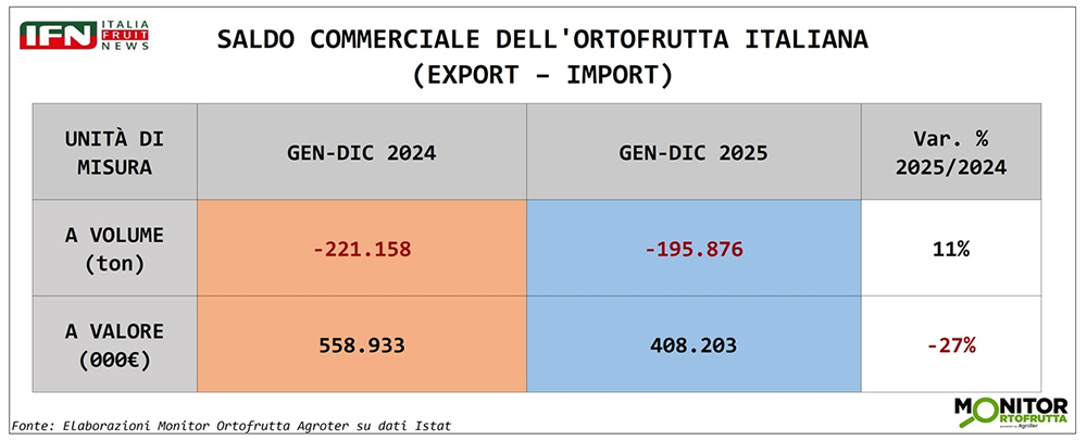 Nel 2025 la bilancia commerciale dell’ortofrutta italiana resta negativa per 196 mila tonnellate, anche se il deficit si riduce dell’11% rispetto all’anno precedente. Sul fronte del valore, invece, il saldo positivo si contrae del 27%, passando da 559 a 408 milioni di euro. In altre parole, l’Italia continua a importare più tonnellate di ortofrutta di quante ne esporti, ma riesce comunque a mantenere un saldo positivo a valore grazie a un export caratterizzato da prodotti di maggior valore.
