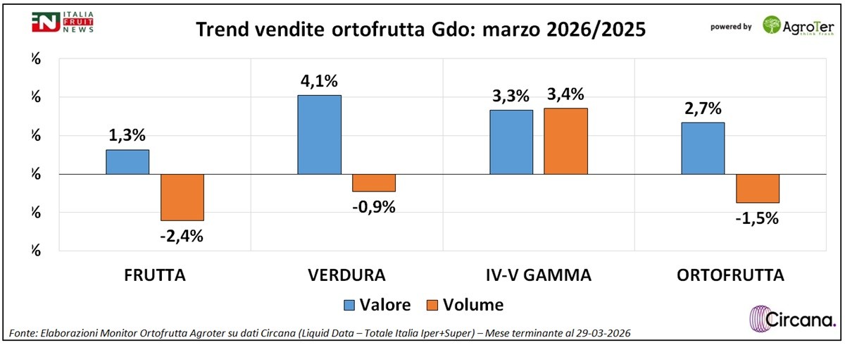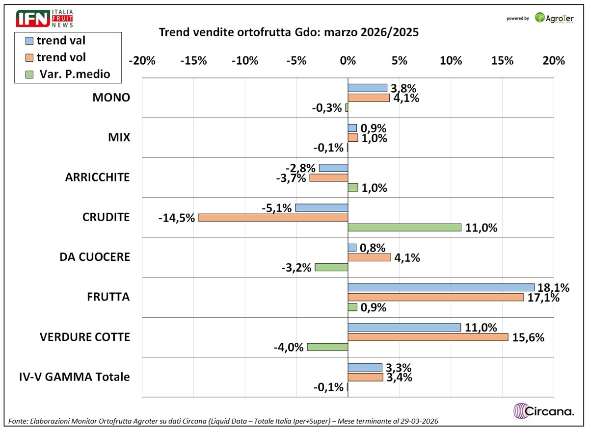 Ortofrutta in Gdo, a marzo calano i volumi ma cresce la IV-V Gamma