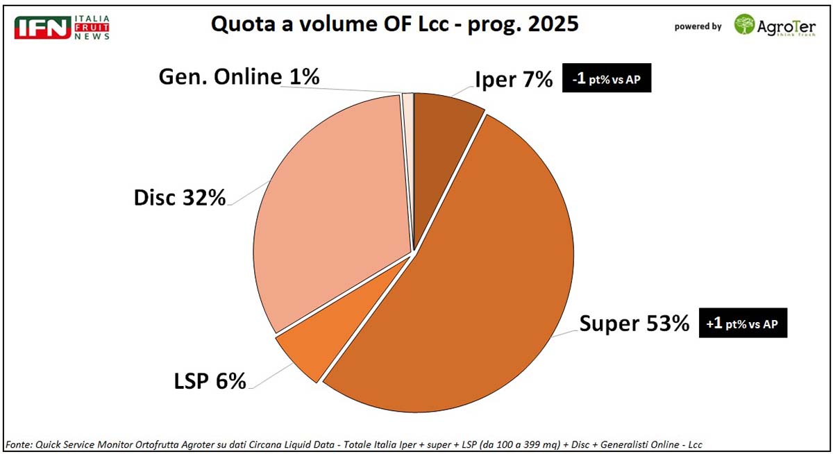 Proprio i singoli canali sono al centro del focus settimanale. Analizzando le quote a volume dell’ortofrutta a peso imposto venduta nella Gdo da inizio anno, emerge con chiarezza la preferenza dei consumatori per i format supermercato e discount, che insieme coprono l’85% dei volumi totali. Rispetto al 2024, si rileva una perdita di un punto percentuale per l’ipermercato, in calo dall’8% al 7%, compensata da una crescita equivalente del supermercato, che passa dal 52% al 53%.