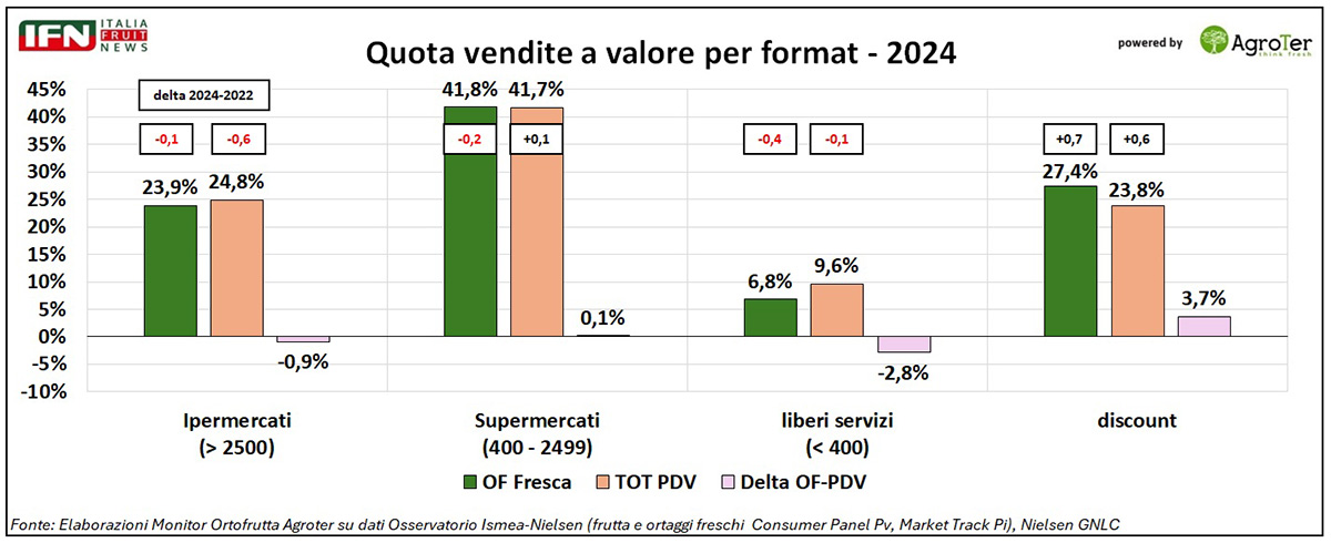 Il peso strategico dell’ortofrutta emerge con ancora maggiore evidenza se si confrontano le quote di vendita per canale riferite a questo reparto con quelle relative al fatturato complessivo dei negozi. Nel 2024, i discount detengono una quota del 27,4% nelle vendite di ortofrutta, a fronte di una quota del 23,8% sul totale del fatturato: un divario positivo di 3,7 punti percentuali. Negli altri format, invece, questa differenza è contenuta e, ad eccezione dei supermercati, non è favorevole all’ortofrutta.