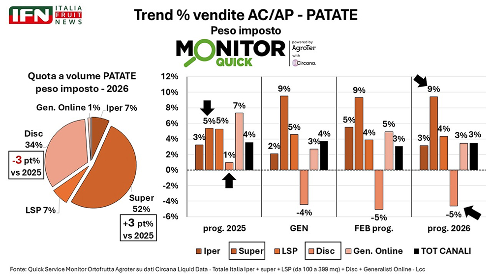 Nella seconda parte della Diretta IFN dedicata al mondo delle patate (per leggere il resoconto della prima parte clicca qui), il confronto è entrato nel vivo delle dinamiche che stanno ridisegnando il comparto. La sfida per la Gdo oggi è gestire una polarizzazione netta: da un lato la richiesta di convenienza dei grandi formati "risparmio", dall'altro la necessità di prodotti “tailor made” , dove gusto, innovazione, grammature più contenute la fanno da padrone. Le parole chiave emerse? Italianità, specializzazione, segmentazione e chiarezza espositiva. Ormai è palese: la patata è un pilastro della dispensa e il modo in cui il consumatore la sceglie sta cambiando radicalmente.