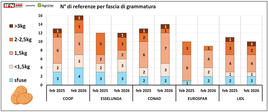 Il numero medio di referenze di patate presenti a banco non registra variazioni significative tra il 2025 e il 2026, attestandosi complessivamente intorno alle 12 unità. A distinguersi è soprattutto Coop, che passa da 13 a 16 referenze, mentre nelle altre insegne gli scostamenti sono minimi: Conad cresce di una proposta, Eurospar e Lidl ne perdono una, ed Esselunga resta stabile con 12 referenze.