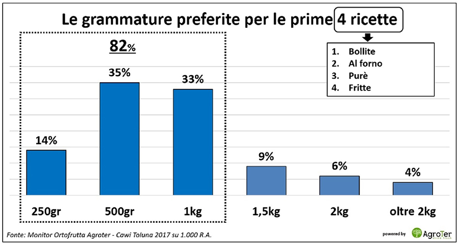 La scelta di proporre grammature più contenute nasce dalle ricerche di mercato sul consumatore, che tende a preferire confezioni piccole, adatte alle principali preparazioni a base di patate — bollite, al forno, in purè o fritte, come si può osservare da un’analisi del Monitor Ortofrutta di Agroter. Nonostante ciò, l’offerta reale dei distributori appare ancora distante dalle aspettative espresse in passato: già nel 2017 i consumatori dichiaravano di preferire formati compresi tra 250 g e 1 kg, mentre oggi il 75% dell’offerta è rappresentato da confezioni da 1,5 kg in su, nei negozi analizzati.