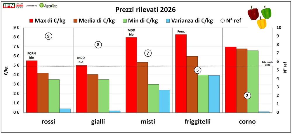 Sul fronte dei prezzi, i peperoni si confermano una categoria con un prezzo medio elevato: nel 2026 la media complessiva si colloca intorno ai 5 euro al chilo, in lieve crescita rispetto allo stesso dato del 2025. Nell’analisi proposta di seguito, i prezzi sono stati distinti per tipologia di peperone dolce, escludendo i peperoncini che avrebbero alterato la scala del grafico. Emergono così differenze abbastanza nette: i peperoni rossi e gialli presentano un prezzo medio inferiore rispetto ai misti, ma sempre nell’intorno dei 5€/kg, mentre i livelli di prezzo aumentano nel caso dei friggitelli e dei peperoni a “corno”. I valori massimi si registrano in tre casi per referenze biologiche e, nel segmento dei friggitelli, per una referenza a marchio del fornitore. Per queste ultime tipologie, così come per i misti, si raggiungono gli 8 euro al chilo.