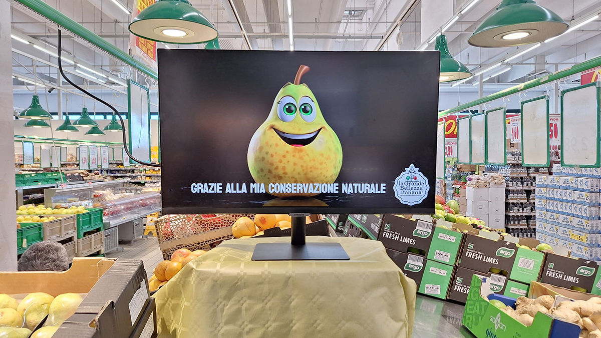 Il focus della rete è sulla William, varietà storica che Odorizzi ritiene ancora ricca di potenziale, anche per attrarre le nuove generazioni. Da qui è nata un’idea innovativa: un vassoio “autoparlante”, realizzato in cartone, con un pupazzetto illustrato generato con l’intelligenza artificiale e studiato per rendere il prodotto più friendly e coinvolgente. «È un approccio di comunicazione giocosa, sviluppato con la nostra Academy in questa primavera, che abbiamo già testato in alcuni punti vendita, dotati di monitor e strumenti digitali per animare il reparto. La prossima fase sarà estendere l’iniziativa alle catene interessate», racconta.