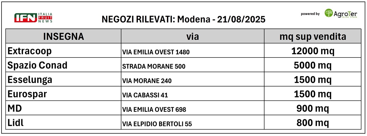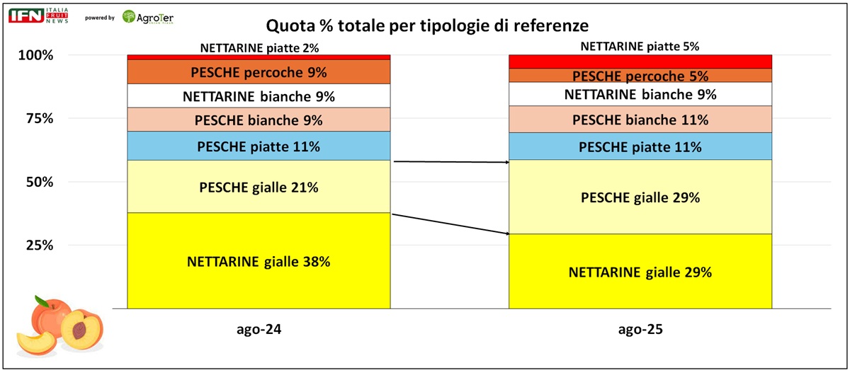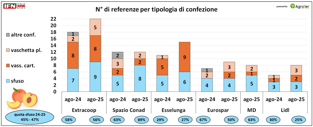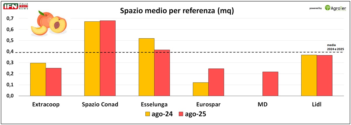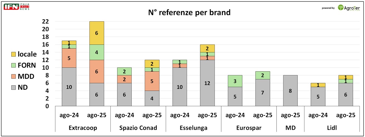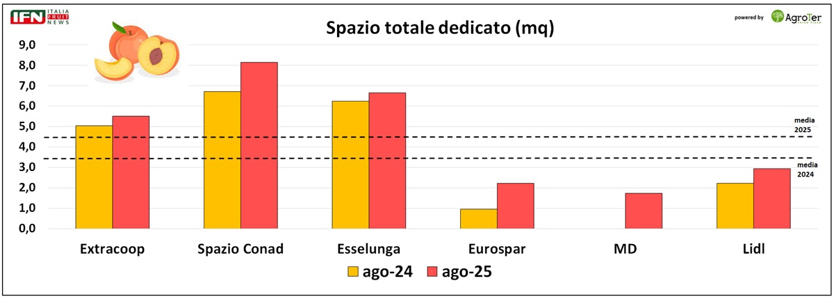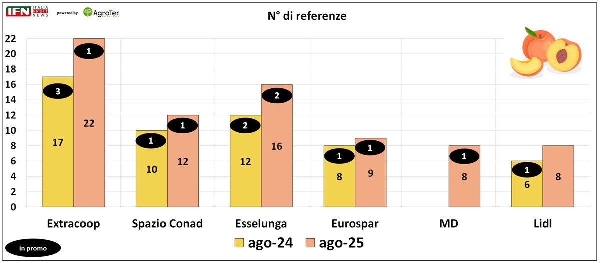Ad agosto 2025 le numeriche complessive di pesche e nettarine risultano in crescita in tutte le cinque insegne già rilevate nel 2024, a cui si è aggiunta una nuova apertura di MD, per dare maggiore rappresentatività al canale discount, ormai radicato in ogni città.