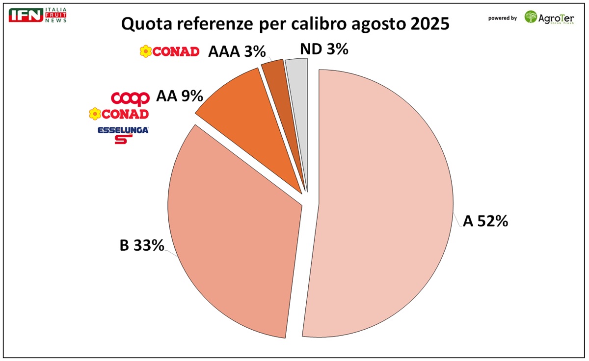 Chiudiamo l’analisi con uno sguardo ai calibri dei frutti. Oltre la metà delle referenze si concentra sul calibro A (52%), seguito da circa un terzo con pezzatura inferiore (B, 33%). Solo il 12% appartiene ai calibri superiori (2A o 3A), presenti soprattutto nei punti vendita con assortimenti più profondi.