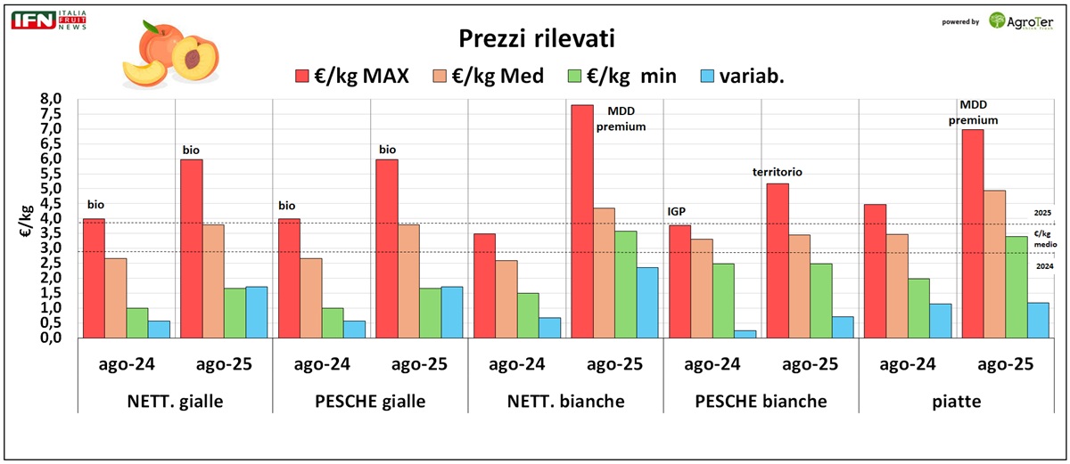 A livello di prezzi, si conferma il trend registrato nei dati di vendita del mercato, con valori medi superiori al 2024, sia a livello complessivo sia per le diverse tipologie di prodotto. Nel 2025, le tipologie con il prezzo medio più alto sono le nettarine bianche e le pesche o nettarine piatte. I picchi si raggiungono per i prodotti bio, le Mdd premium o prodotti del territorio o Igp.