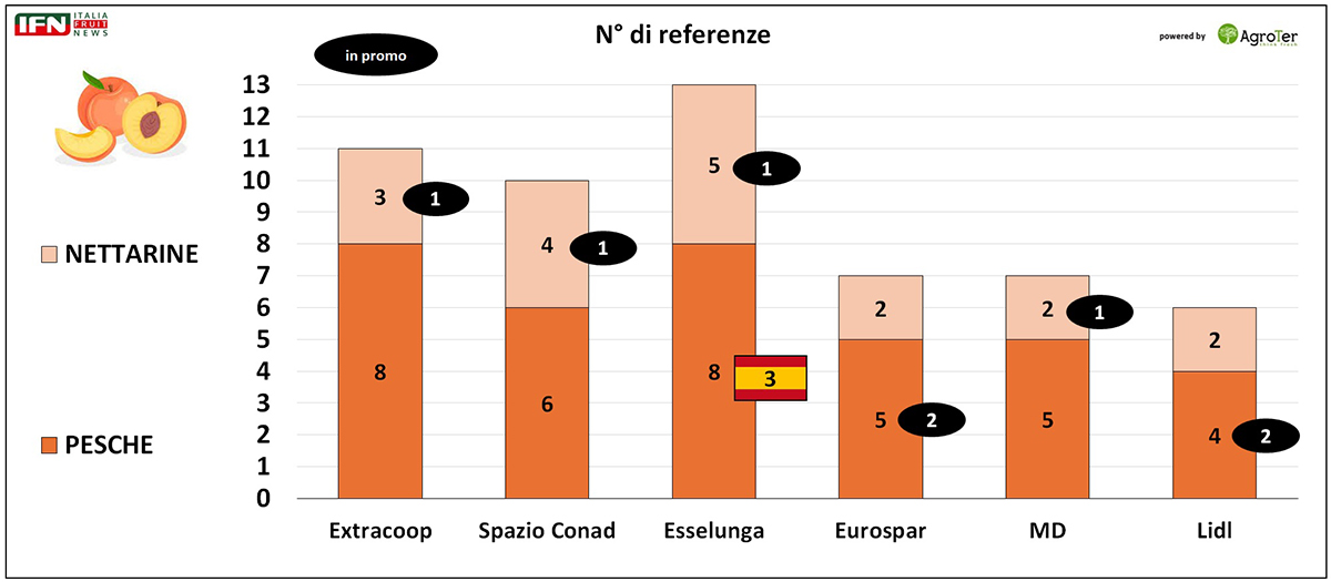 In tutte le insegne si conferma la predominanza delle pesche rispetto alle nettarine, ma sono proprio queste ultime a concentrare il maggior numero di promozioni (in 4 negozi su 6), anche se Eurospar e Lidl hanno fatto una scelta opposta con 2 referenze in promozione nelle pesche.