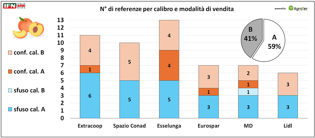 Il calibro A rappresenta una fascia di frutti di buone dimensioni e, negli assortimenti analizzati, costituisce la maggioranza delle referenze (59%) ed è associato principalmente al prodotto sfuso — con l’eccezione di una referenza in MD.
