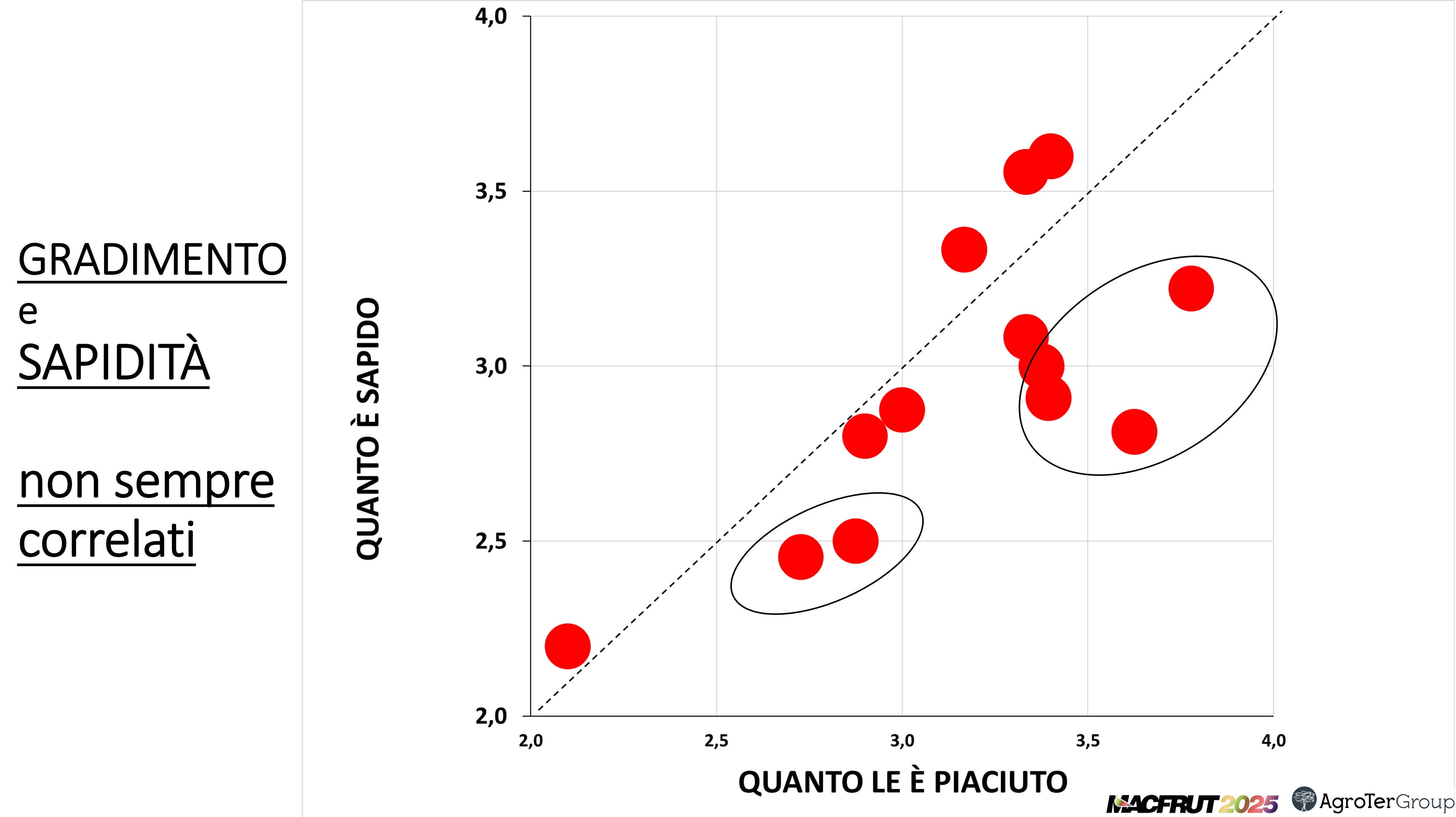 I risultati principali hanno confermato l’estrema complessità della categoria nelle preferenze e nelle ricettazioni preferite del consumatore. È emersa, in primis, la non completa correlazione tra sapidità (o sapore) del pomodoro e il gradimento complessivo, poiché nel giudizio e nella scelta finale del consumatore concorrono tanti altri fattori: il grado di acidità e il retrogusto, ma anche la piacevolezza al morso e alla masticazione, senza dimenticare come anche l’occhio voglia la sua parte, con preferenze accordate a pomodori con colori sgargianti o insoliti, anche se con voti sul gusto non particolarmente alti.