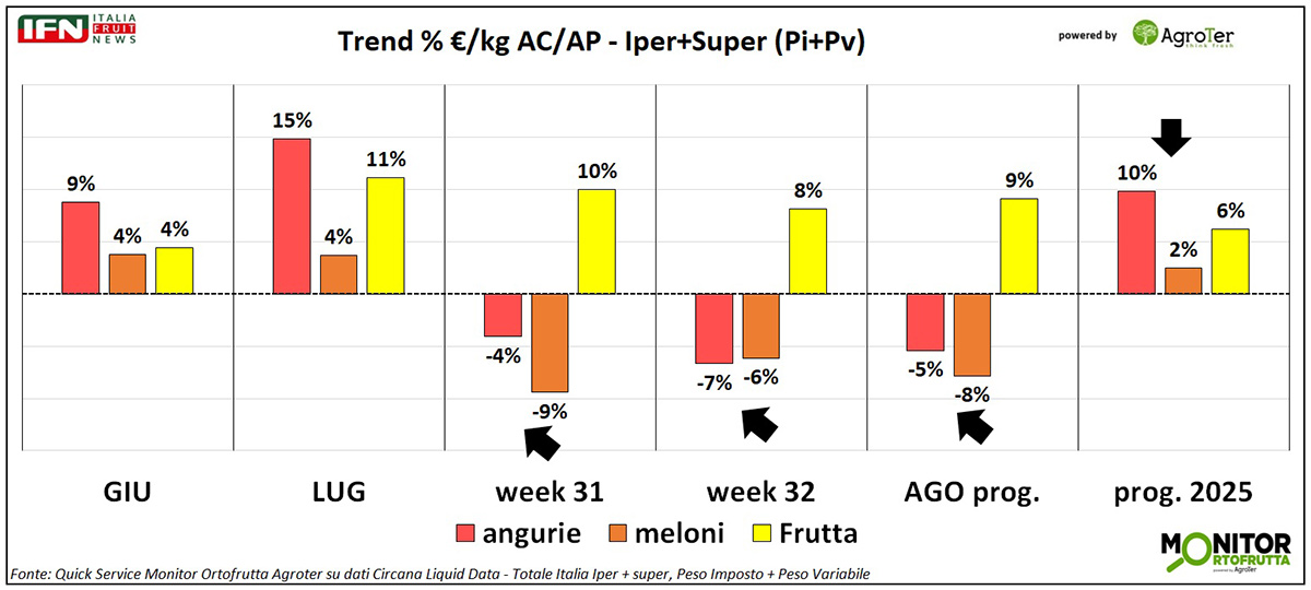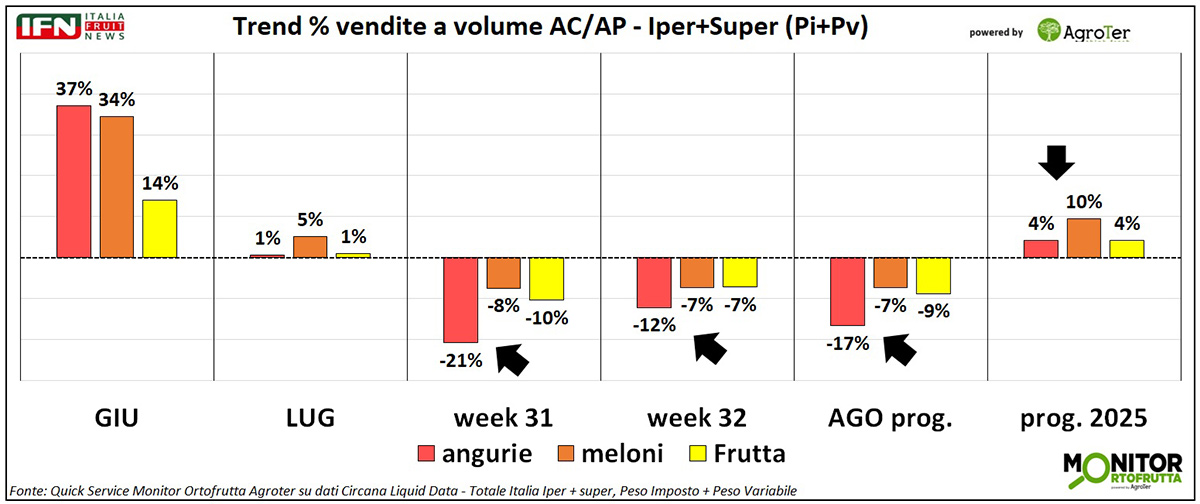 Una possibile spiegazione arriva anche dall'andamento climatico. Dopo un giugno più caldo e un luglio con temperature medie sostanzialmente in linea con il 2024, l’avvio di agosto ha segnato un brusco calo: -4 gradi nella week 31 e -2 gradi nella week 32. Per frutti estivi come angurie e meloni, questo spesso incide sui consumi e sulla controcifra rispetto all’anno precedente.