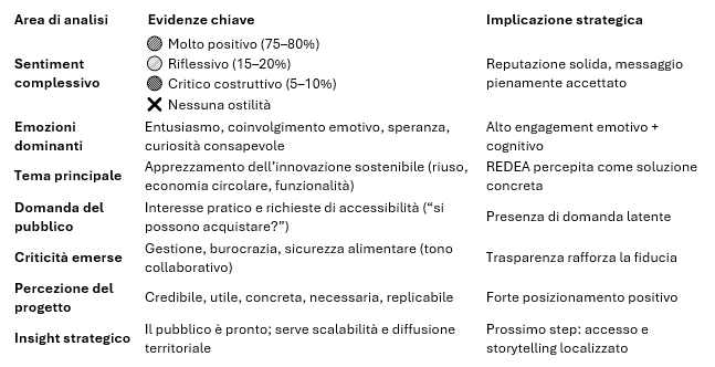 L’analisi qualitativa delle interazioni mostra un giudizio molto positivo, con una partecipazione attiva e consapevole da parte della community. Le parole più ricorrenti – bellissime, fantastiche, concrete, utili, necessarie – restituiscono l’immagine di un’innovazione percepita come credibile e funzionale, non come un’idea astratta o un’operazione di greenwashing.