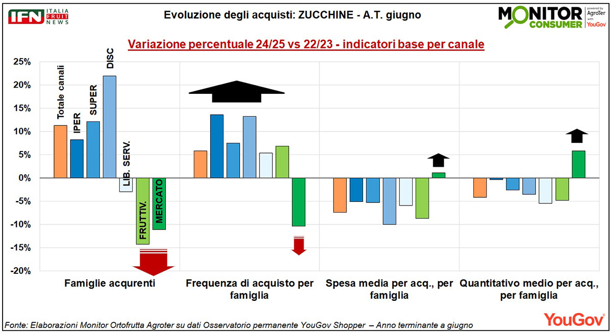 Anche la frequenza d’acquisto delle zucchine risulta in crescita (+6%), seppur in misura più contenuta rispetto alla media delle verdure (+11%), a indicare che spesso vengono acquistate come prodotto “di scorta” rispetto ad altri ortaggi.