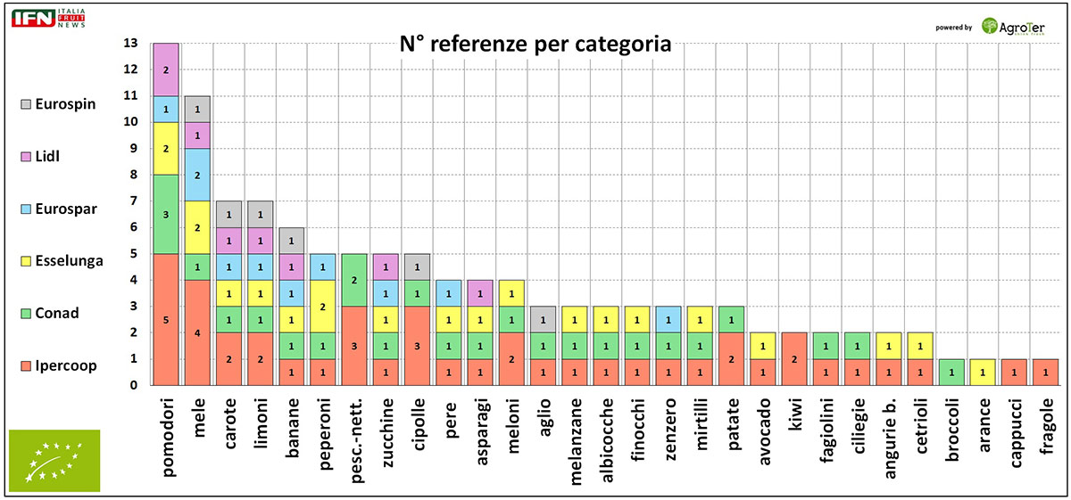 Passiamo ora ad analizzare come gli assortimenti si articolano a livello di specie o categorie, stilando una classifica basata sul numero complessivo di referenze rilevate. In testa troviamo pomodori e mele, due categorie di grande rilevanza, con i pomodori - in particolare - che beneficiano della stagionalità e risultano quelli più trattati delle insegne. Va però segnalato che da Eurospin i pomodori erano assenti, mentre Coop e Conad proponevano rispettivamente 5 e 3 referenze.