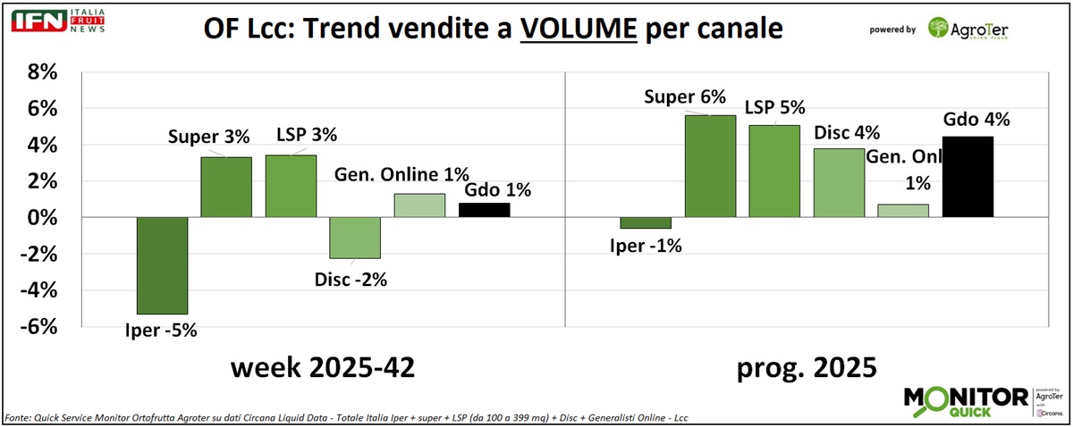 Nella week 42, l’ortofrutta Lcc resta in territorio positivo (+1% a volume) con prezzo medio mix in flessione