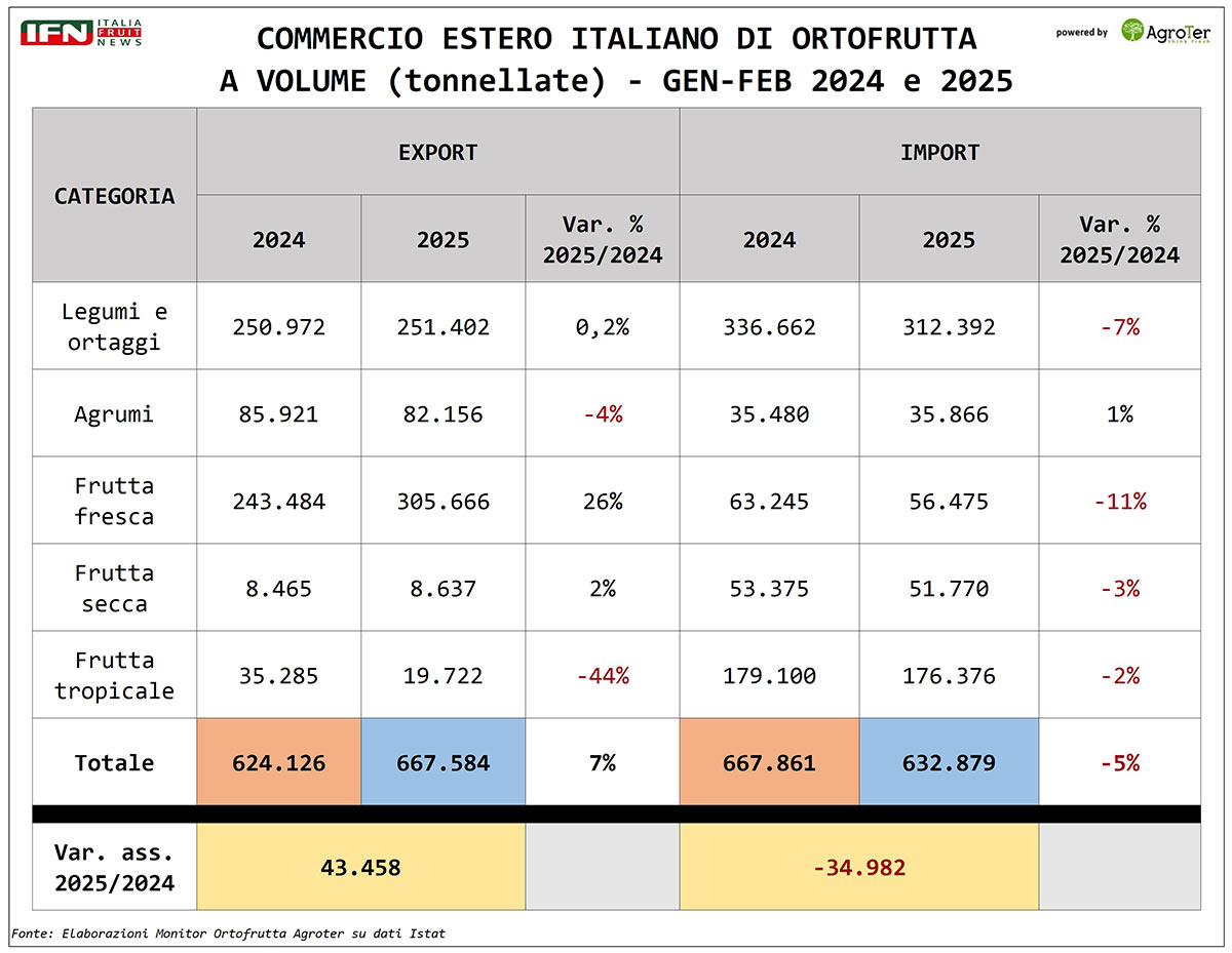 È quanto emerge dalle analisi del Monitor Ortofrutta di Agroter, basate sull’ultimo aggiornamento dei dati Istat. Nel progressivo a febbraio, l’export italiano di frutta e verdura aumenta del 7% a volume, con un incremento a doppia cifra (+11%) nel corrispettivo a valore. Le importazioni, seppur in calo nei volumi (-5%), costano di più: l’esborso complessivo sale, infatti, del 9% a causa dei prezzi più elevati dei prodotti esteri.