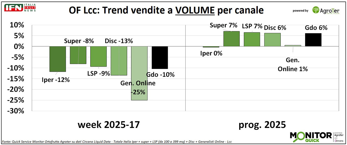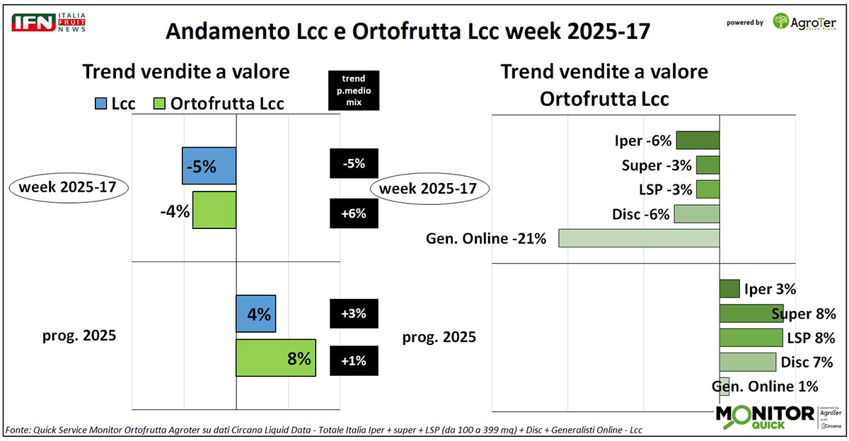 La settimana 17 chiude il mese di aprile con trend a valore negativi, in controtendenza rispetto alle settimane precedenti, sia per l’Lcc (-5%) sia per l’ortofrutta Lcc (-4%).