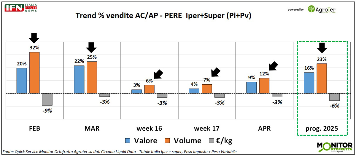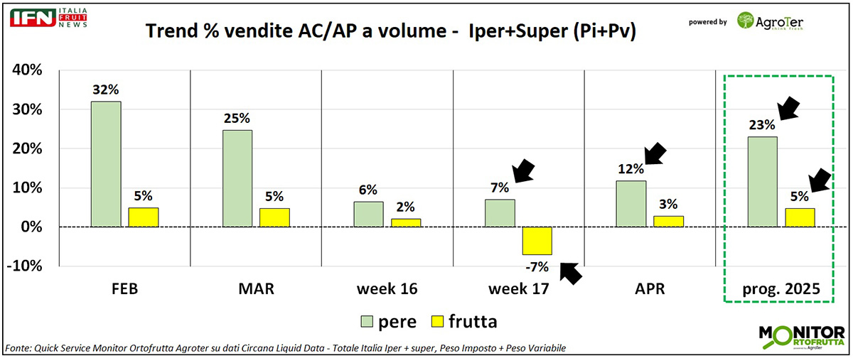 Il risultato positivo delle pere appare ancora più solido se confrontato con l’andamento generale della frutta: i trend delle pere si mantengono costantemente superiori, anche nella settimana 17, in cui la frutta registra una flessione, mentre le pere continuano a crescere.