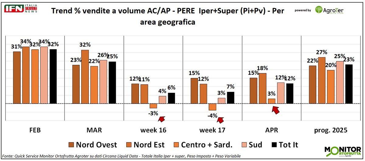 Pere +23% a volume nel 2025, molto meglio della frutta, ma il Centro soffre