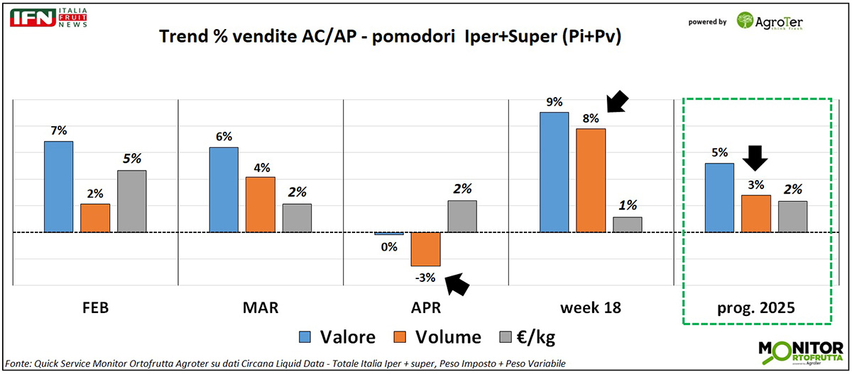 Significativa la performance dei pomodori, che da inizio anno registrano una crescita del 3% a volume e del 5% a valore, offrendo un contributo rilevante ai risultati del reparto, dato il loro peso nelle vendite. Dopo due mesi positivi – febbraio (+2%) e marzo (+3%) – i consumi rallentano ad aprile (-3%), per poi segnare una netta ripresa nella prima settimana di maggio (week 18: +8%).