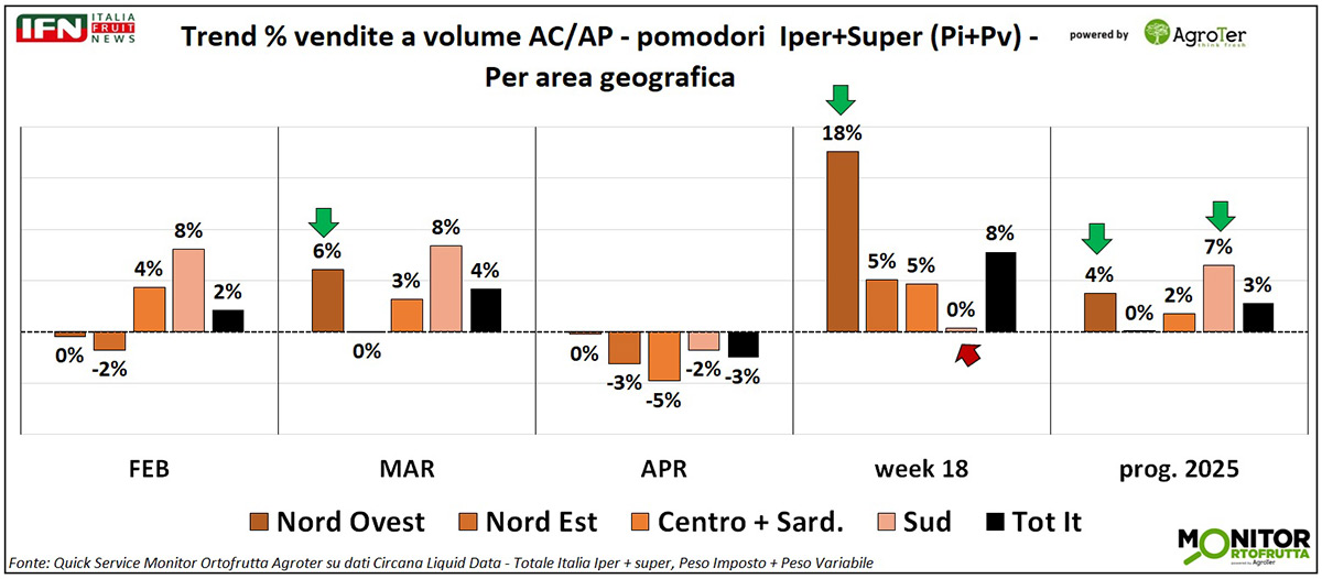 Nella settimana 18, le vendite a valore dell’ortofrutta a peso imposto registrano una lieve crescita, mentre il Largo Consumo Confezionato mostra un leggero calo. Tra i canali distributivi si distingue il libero servizio, mentre gli altri rimangono più in ombra. I pomodori mantengono una buona performance dall’inizio dell’anno, sebbene il loro andamento risulti meno brillante rispetto al comparto della verdura in generale. A livello territoriale, si segnalano risultati particolarmente positivi nel Sud e nel Nord Ovest.